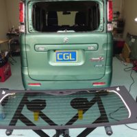SUZUKIスペーシアのリアガラス交換です、リアガラスは粉々に飛散してしまい保管やセキュリティ的にも危険ですのでなるべく早急に対…